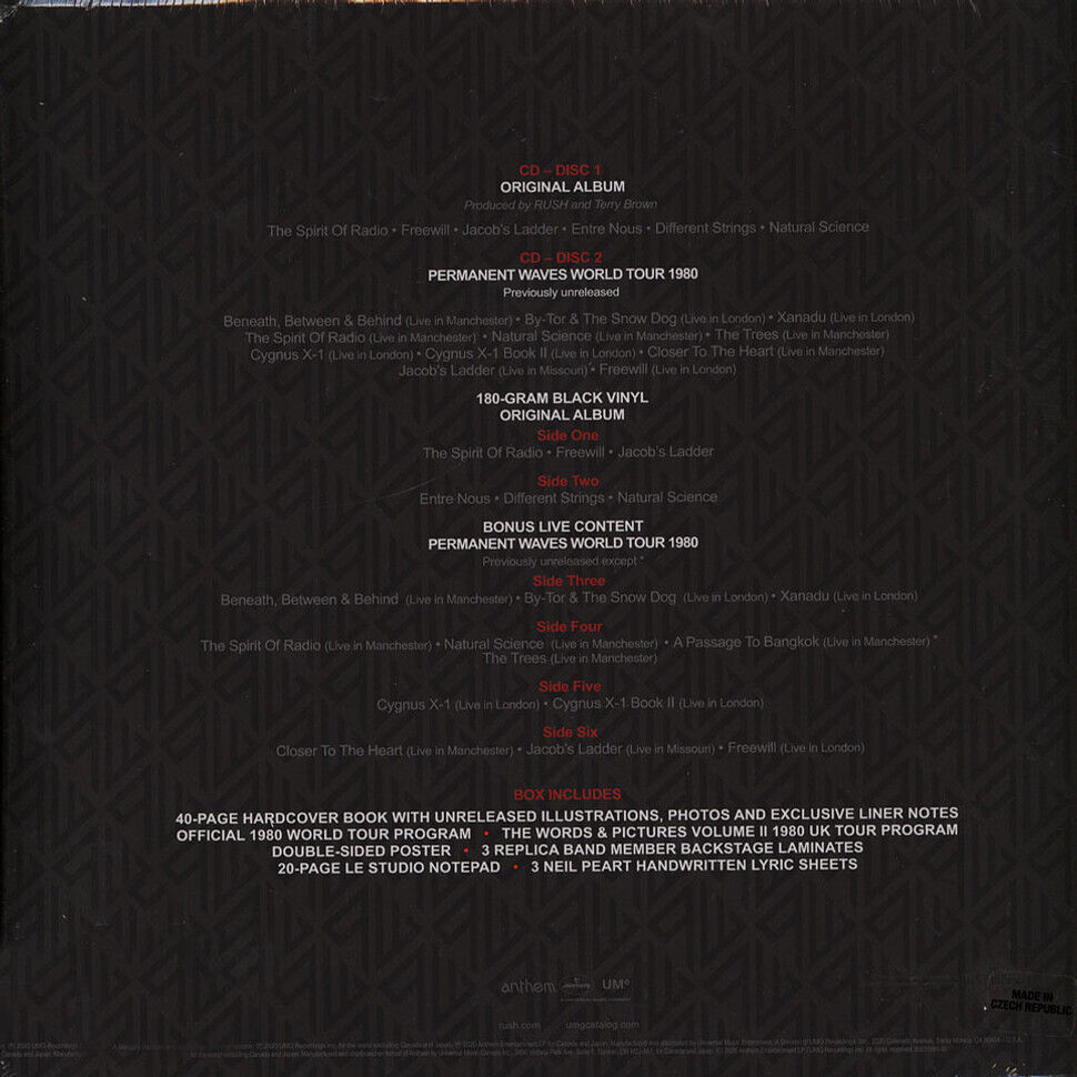 • Exclusive Bonus Items:  Permanent world tour 1980 program, The Word and Pictures Volume II UK tour 1980 program, 3 replica band permanent waves world tour 1980 laminates, 3 neil peart hand-written lyrics sheets, Le studio 20-page notepad, 24" x 36" double-sided wall poster